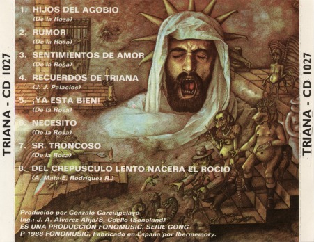 La otra gran diferencia respecto a “El Patio” es la cuidada producción, minuciosa en extremo, que explota al máximo las cualidades del sonido del grupo. Además, podemos decir que “Hijos del Agobio” es un disco conceptual. El concepto, si me lo permiten, no sería otro que el cabreo ante la situación en la se vio inmerso nuestro país tras la muerte del dictador. Las canciones de “Hijos del Agobio” rezuman furia, indignación, son combativas, indómitas. Pero vayamos paso a paso. Musicalmente hablando, Triana nunca estuvo tan cerca de King Crimson. La sombra de Robert Fripp planea sobre casi todas las intervenciones de Antonio Pérez. Canciones como “Ya está bien” o“Necesito” podrían ser la versión “trianera” de la célebre “21st century schizoid man”.