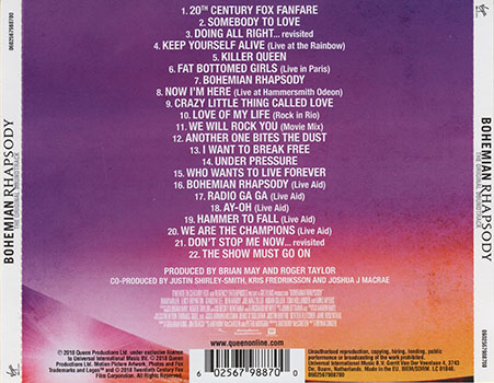 Banda sonora de la película Bohemian Rhapsody que cuenta la historia de Queen, su música y la vida de su extraordinario líder y cantante Freddie Mercury. Por primera vez algunos de los audios de la legendaria interpretación de la banda en el Live Aid se publicarán como parte de la banda sonora de esta película. Junto a estas impresionantes interpretaciones del Live Aid de Bohemian Rhapsody, Radio Ga Ga, Hammer To Fall y We Are The Champions, el álbum incluye otros temas en directo de toda la carrera de Queen, nuevas versiones de viejos favoritos, y una selección elegida de los mejores temas de estudio de Queen.