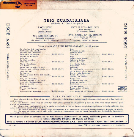 Trio Guadalajara 1962 - Paco Peco (EP SELLO Odeón DSOE 16.492)