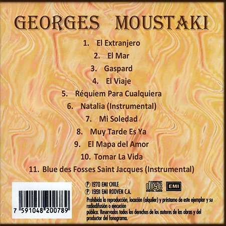 Álbum editado en Chile por EMI CHILE en 1970, distribuido por EMI RODVEN C.A en 1991. Recoge la versión en español de algunos de los primeros temas de Moustaki, entre los que se encuentran: El extranjero, El mar, Gaspard, El viaje, Réquiem para cualquiera, Mi soledad, Muy tarde es ya, El mapa del amor y Tomar la vida. Además incluye dos temas instrumentales: Natalia y Rue des Fosses Saint-Jacques.