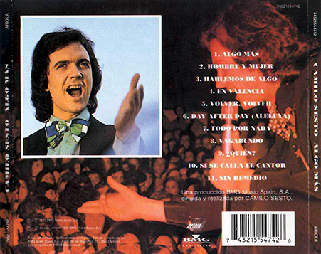 No podemos decir lo mismo de la ranchera superconocida “Volver, volver” que no va demasiado a las características vocales de Camilo y que maldita la falta que hace en este buen disco. Por supuesto, una referencia a “Algo más”, otro de los grandiosos hits de Camilo, llena de potencia en el estribillo y que durante años y años fue coreado por el publico de tres continentes en sus actuaciones en directo.