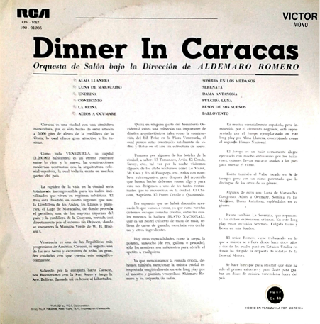 El álbum grabado por Romero fue Dinner in Caracas, su primer disco LP, realizado con músicos estadounidenses y dos venezolanos, uno de ellos el propio Romero, y el otro, el contrabajista. Esta grabación fue realizada en formato monaural, en momentos en que la estereofonía y la grabación multipista aún no hacían su aparición formal.