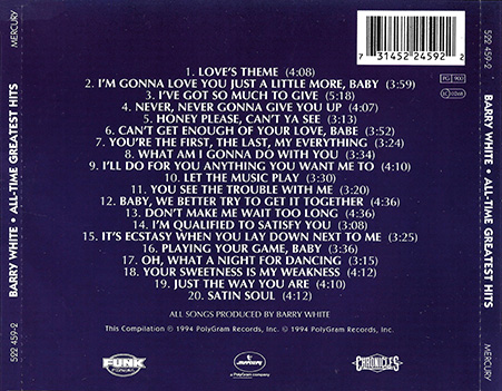 Entre los principales éxitos de Barry White en single hay que destacar Never never gonna give ya up, Can’t get enough of your love babe y You’re the first the last my everything (74), What am l gonna do with you, I'll do for you anything you want me to y Let the music play (75), You see the trouble with me, Baby we better try and get it together y Don't make me wait too long (76), I'm qualified to satisfy, It's ecstasy when you lay down next to me (77), Just the way you are (78), Sha la la means i love you (79), Sho' you right (87), Never never gonna give you up y For your love (I'll do most anything)(88), Practice what you preach e I only want to be with you (95), finalmente una reedición con arreglo especial del tema Let the music play (2000).