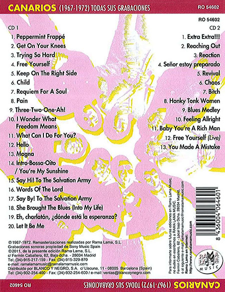 Se ha hecho esperar durante décadas, pero ya está aquí por fin el recopilatorio de la obra de Canarios. Los singles grabados en España y el contenido completo de los LP: "Libérate" (Sonoplay-Barclay, 1970) y "Canarios Vivos" (Ariola, 1972).
