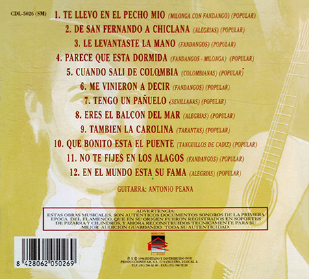 Por citar algunos temas, selecciona: ‘Linares ya no es Linares’, soleá y alegrías de 1959; ‘De la alegre Andalucía’, colombiana de 1960; ‘Dicen que a río revuelto’ fandangos de 1960; ‘Glosa a La Giralda’, milonga y fandango de 1962; ‘De Córdoba la llana’, alegrías de Córdoba de 1963; ‘El candil se me apagó’, taranta de 1965; todas con Antonio Peana.
